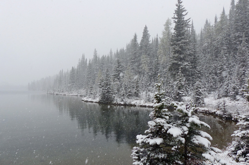 顶风冒雪的在山林中穿行,我们终于又绕回了Cerulean Lake。迷蒙的山水早已笼罩在惨淡的灰色之中,配上漫天飘舞的雪花,倒显得份外朦胧静谧。