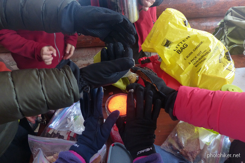 午饭时间大家又都聚集到Shelter里,其实并没有什么正经的午餐,不过是吃些Nuts,水果干等零食,喝几口热水,顺便找个地方躲避风雪。在烧水的间隙,大家发现没有明火的Reactor是个用来烤手套的好东西,于是就见一群人伸着手围着个小火炉,手上湿乎乎的手套烤得直冒热气,那景象竟有几分凄惨。