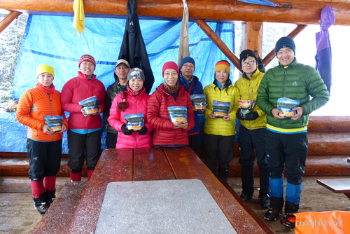 半夜醒来就听见雨点打在帐篷是噼里啪啦的声音,这样的天气起身出去上厕所实在太痛苦了,还是忍一忍接着睡吧。一直到天光放亮雨还是淅淅沥沥的下着,四周云雾低垂,如此湿冷的时节再也没有什么能比吃上一顿热腾腾的早饭,喝上一杯香喷喷的咖啡更令人向往了。大家起床后都直奔Shelter,一个个都穿得里三层外三层的。其中最夸张的要属大牛夫妇,这从里到外足足穿了6层,而且五颜六色的堪比彩虹啊。其实这样的温度穿4层足矣,一件贴身的羊毛内衣,保暖的抓绒和羽绒各一件,再加一件防雨透气的冲锋衣,不知对器材颇有研究的CEO又穿出了什么讲究。