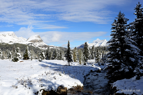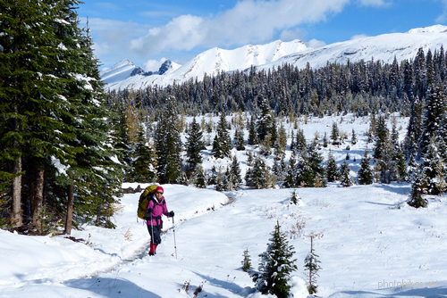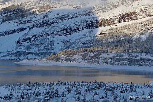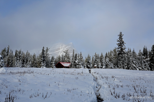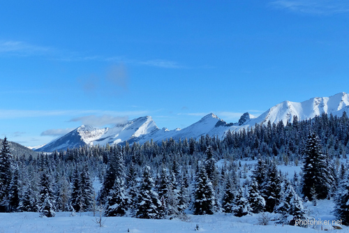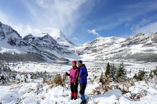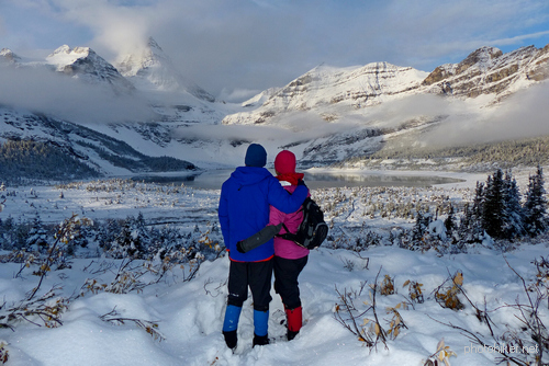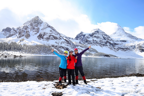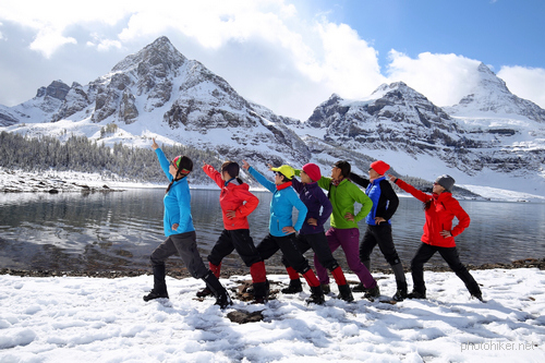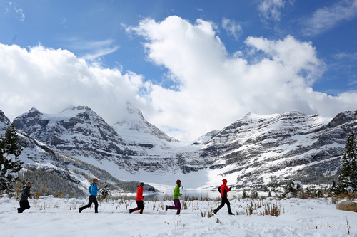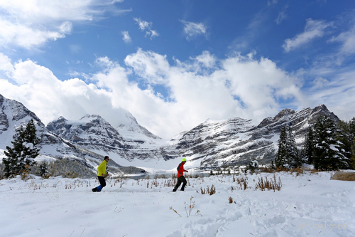 安顿好行李,确认了我们的将坐12点的飞机之后,看时间还早,大家伙又兴高采烈的四散拍照去了。此时太阳已经升得很高了,蓝天白云,加上冰雪晶莹的洁白,远山近水都显得那样苍劲雄浑。我们向湖边走去,一路上不时的停下来拍个合影,近旁或是雪野苍茫,或是小路弯弯,而背景,永远是那巍峨挺拔的Mount Assiniboine。