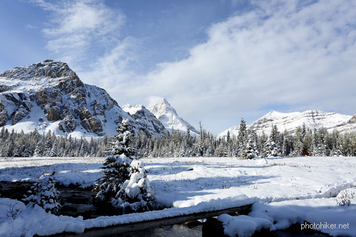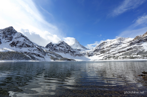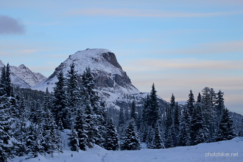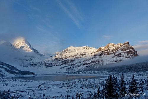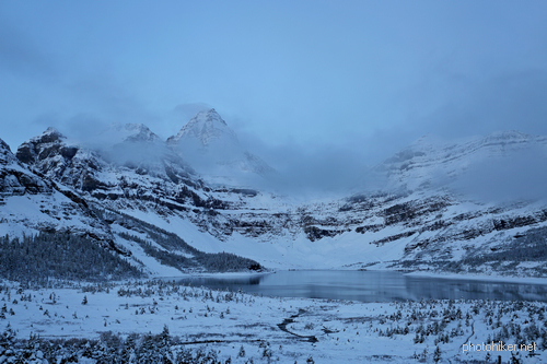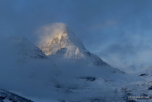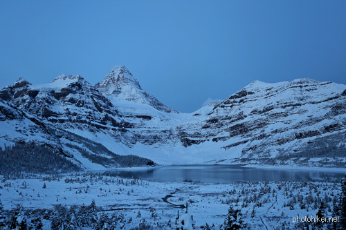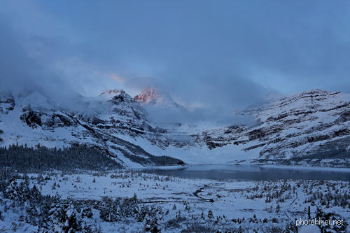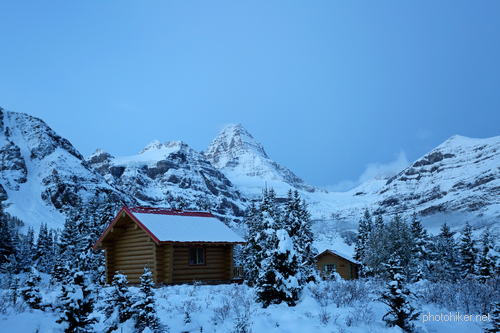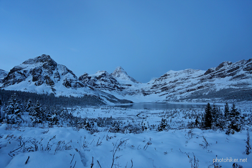 大家收拾齐整,背着沉重的相机脚架赶往湖边。一出门就发现门口的小路上结结实实的全是冰,走上去一步一滑的象溜冰场似的,以至于刚过了门前的小桥Eva就决定不往前走了。眼看东方晨曦微露,借着清冷的晨光,赫然发现Mount Assiniboine那挺拔高耸的主峰竟已摆脱云雾,清晰的,静静的伫立在黎明时分幽蓝的天幕中。在路上我们数次忍不住停下了拍照,生怕错过此时他又会隐身云中。