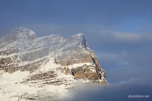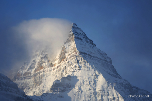 在这个如冬日般清冷的早晨,Mount Assiniboine以及他周围的山峰才是第一次坦荡而清晰的展现在眼前。左边是庞然坚实的Terrapin Mountain和Mont Magog,右边是连绵起伏的Wedgewood Peak和Sunburst Peak,而正中巍然屹立的就是每个人都心心念念,如今终于得见真颜的Mount Assiniboine。与周围簇拥的群峰相比,Mount Assiniboine有着傲人挺拔的身姿。那金字塔般巍峨的雪峰在清冷幽蓝的天空中显得异常峭立高峻,彰显着天地之间唯我独尊的王者风范。