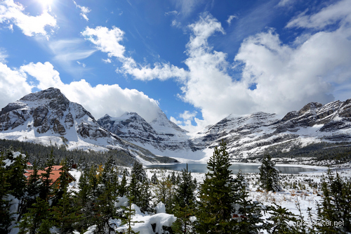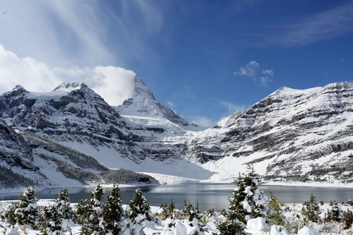然而就在此时,明媚的朝阳终于跳出了山影的羁绊,用眩目的金色瞬间点亮了Mount Assiniboine那金字塔般的巍巍雪峰。雪山金顶,轻云飘渺,大自然再一次用他神奇的画笔描绘出眼前光彩照人的旖旎景色。