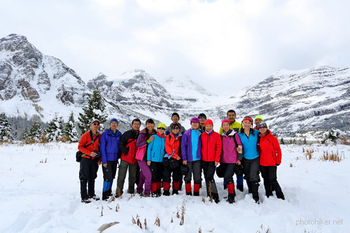 中午时分大家陆续都回到了Lodge门前,15个人终于凑齐拍下一张雪山脚下的大合照。