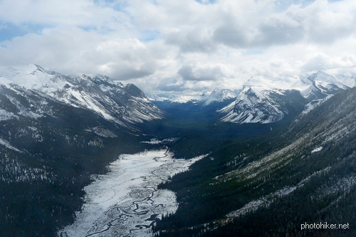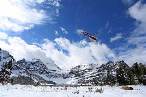 飞机降落之后,大家开车的开车,搬行李的搬行李。其他人也分乘后两班直升机很快就到了。Josie下飞机的时候身上竟然背着个硕大的相机包,原来大牛上飞机的时候竟然往了背自己的相机包,幸好被Josie及时发现带了出来。这三忘大师真是名不虚传。因为计划有变,GM决定我们15个人分乘两辆车出山,到Canmore之后兵分两路,司机们去Sunshine Village取车,其他人采购给养,还要订今晚的住宿。如今特殊时期,小小的违章一下也实属无奈,原本计划Allison,Josie,Joyce和我四个比较苗条的女生在后排挤一挤,没想到因为Joyce随身细软太多,最后派来的竟是小胖妞QQ。这下四个人在后排那个挤啊,简直是动弹不得。到了Canmore城里,很多路口竟然都有摄像头,我们不得不委屈Josie半躺半坐,QQ和Allison一左一右的挡住她,以图平安过关。
