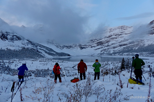 美景当前,大家都一丝不苟的认真拍片,广角长焦的全用上了。随着天越来越亮,一团团云雾不知从何处飘来,如水中涟漪般荡漾在群峰之间。方才还是冷峻威严的山峰渐渐的被团团袅娜的云雾缠绕,少了几分硬朗,添了几许婉约。尤其是Mount Assiniboine,那高高耸立的尖尖的山顶在漫卷的云雾中时隐时现,时而似玉带缠腰,时而如轻纱遮面。