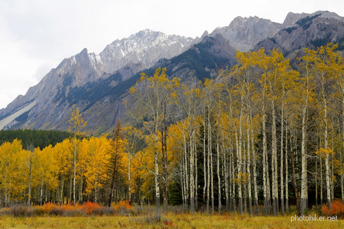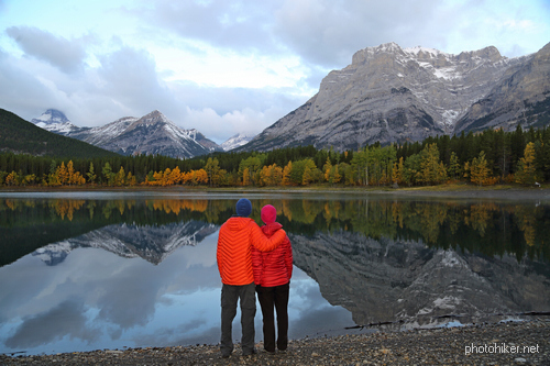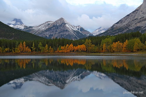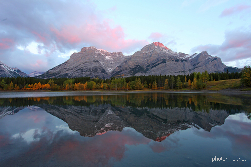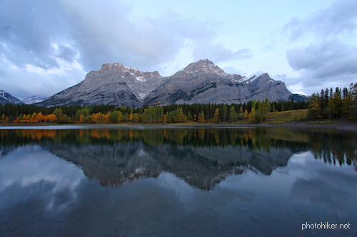 晨曦微明,大家轻车熟路的来到了Wedge Pond。今天薄云轻拢,无风无雨,Mt. Kidd参差错落的主峰静静的伫立在灰蓝色的天幕中,仿佛触手可及的高大。眼前小小一泓碧波中倒映出清晰的山影,原本苍凉粗犷的山体在水影之中平添了几分柔和舒缓。