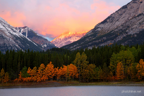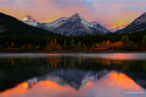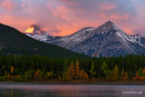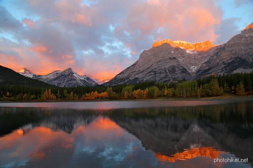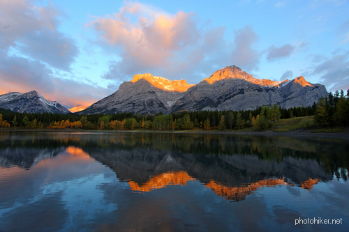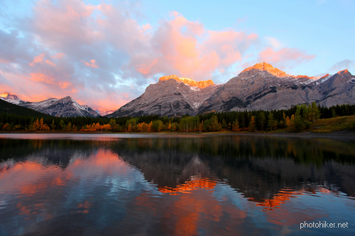 而就在The Wedge Mt.被绚丽的朝霞环拥之时,Mt. Kidd的主峰亦如同火炬般被初升的朝阳点亮。那巍峨山巅的一抹金红恍若瑰丽的皇冠,有彤云相护,倒影相和,一幅浓墨重彩的画卷诠释了大自然的最美。