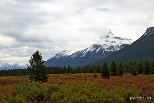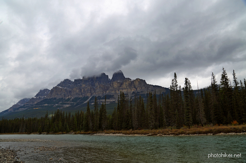 俗话说“朝霞不出门,晚霞行千里”。今早绚丽的红霞也就意味着今天的天气好不到哪儿去。过了Banff没多久天就阴沉了下来,虽然没有下雨,但天空一直是阴云密布。1A公路沿途有许多景点,我们仰望了一下Castle Mt.的雄姿,又在Moose Meadow附近看了看秋色,一路晃晃悠悠的来到了Lake Louise。先去Visitor Center咨询,随后商定下午就去Lake Agnes看看 ,喝喝茶,观观景。