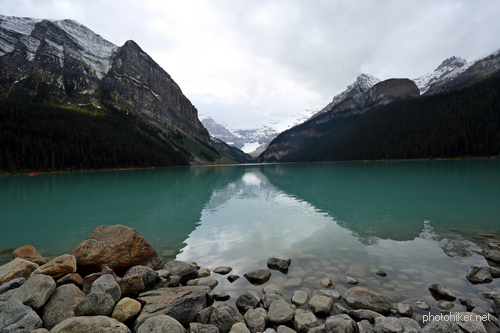 虽然天气不好,也不是长周末,但午后的Lake Louise依然是人潮汹涌。三辆车好不容易各自找到了停车位,然后就溜达到湖边集合。距离上一次站在湖边,时间竟然已经不可的过去了9年,不得不感叹时光飞逝啊!远望那莹莹绿色的湖水尽头耸立的Mt. Victoria,9年前在这里度过的日日夜夜依然记忆犹新,恍若隔日。离开湖边后山道盘桓而上,虽不陡峭但很漫长,体力好的转眼就没了影,其他人在后面慢慢爬,队伍很快就分散开来。