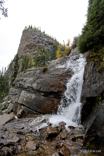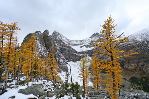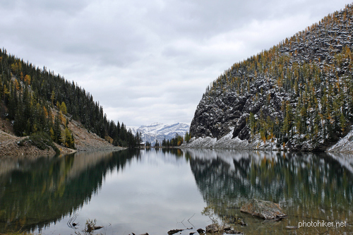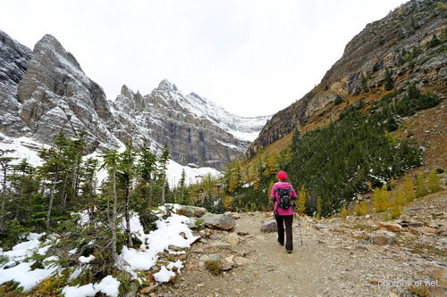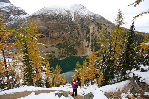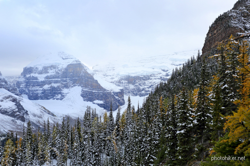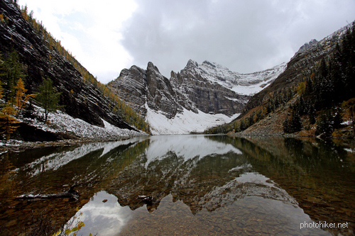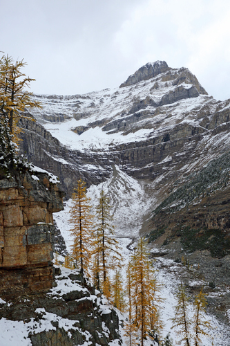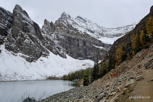 爬上小瀑布旁的木梯就来到熙熙攘攘的Tea House。印象中的Lake Agnes高山环拥,山清水秀,如今巍峨的Mt. St. Piran和Mt. Niblock峭壁高耸,冰雪盖顶,在灰沉沉的苍穹下凸显着苍劲冷酷。虽然山坡上的金松和岸边的灌木添了几许秋色,但已全然没有了当初晴朗夏日里的温婉秀美。
