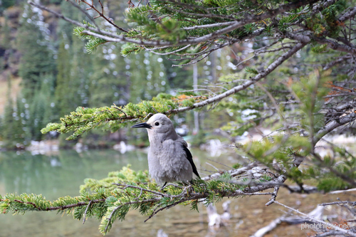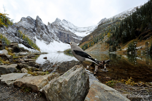 一只Clark’s Nutcracker居然大摇大摆的飞到身边来要饭。这鸟大概常年在此驻守,一点也不怕人,Guanwei用超广角都能给它轻松拍照。
