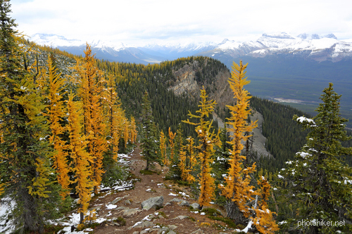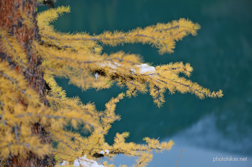 随着山路盘旋而上,我们很快就穿行于层层叠叠的金色松林间。透过那细密针叶上的一缕缕金黄,Lake Agnes的湖水显得异常浓绿醇厚,对面的Mt. Niblock也愈发威严高耸。