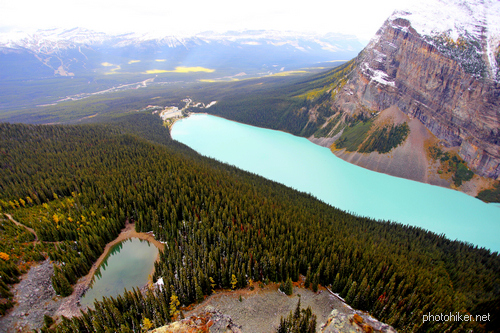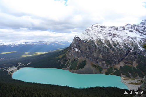 爬到山顶之后左边一条标记不甚明显的小路一直通向Big Beehive悬崖边的Lookout。站在山崖之巅,最迷人的景色莫过于静卧山下,温润如玉的Lake Louise。那蓝绿相间的色彩学名Tiffany Blue,却有着翡翠般温和醇美的绿。