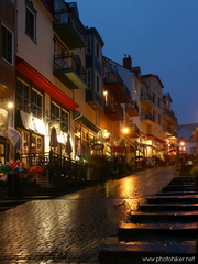 进入魁省后沿途的景致逐渐起了变化,在安省东部枫叶刚开始稀稀落落的变红,而 这里已经有了层林尽染的感觉。一路仍然是走走停停,到下午五点钟才终于来到翠湖山庄。刚刚拐进度假区的小路时,GuanGuan和我同时惊呼起来,眼前所见实在是太不真实了。层峦叠彩的群山中云雾缥缈,五颜六色的别墅掩映其中,真是恍若仙境呀!山庄里的道路简直如同迷宫一般,几经周折才终于找到酒店的入口。我们的房间在顶楼(楼高4层),楼下是游泳池,窗外就是秋意浓浓的湖光山色。晚上我们冒雨在村里转了转,被雨打湿的石板小路在路灯下泛着清冷的光,衬得两旁的橱窗感觉更加温暖。晚饭时回到酒店对面的一家餐厅,美酒佳肴,十分心满意足。