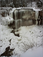 08年的冬天大雪一场接着一场,在冰天雪地中Snowshoeing成了我们唯一的消遣。偶然的一次远足我们选择了去过多次的Webster Falls,当我们深一脚浅一脚的爬上小山坡后,赫然发现那原本再熟悉不过的景致已完全变了模样。曾经的绿树繁花如今被白雪覆盖,天地间仿佛只剩下黑白二色。瀑布水量丰沛,水流泛着淡淡的黄色,在一片冰雪围绕的洁白中显得细腻柔和。两侧的崖壁上布满了长长短短的冰挂,玲珑剔透,如同工艺品一般。我们顺着陡滑的铁梯艰难的下到瀑布底下,湍急的水流配上千姿百态的雪枝冰凌,还真是出乎意料的美丽。离Webster Falls不远的Tews Falls更是风姿卓约,夏天纤细如丝的水流此时已恢复了轻纱漫卷的飘逸,最引人注目的是瀑布下端数米厚的冰层,坚实的冰雪已泛着微微蓝光,迅猛下落的溪水将冰层冲开一个巨大的缺口,透着那么神秘莫测。