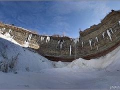 之水仿佛从天而降,那一刻深深的体会到天地之大,而自己是那样的渺小。另一个令人叹为观止的是悬崖上密布的大大小小的冰挂,远看白花花一片,在阳光下更显得晶莹剔透,象是一件件精心雕刻的工艺品。只不过在阳光的照射下许多冰挂已开始融化,不时有断裂的冰柱坠落下来,在山谷之中轰然作响。虽然隔着足够远的距离,但那种隆隆的巨响不时回荡在空旷的山谷之中,感觉实在是恐怖。GuanGuan和我没敢久留,拍完照片就撤退了。