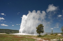 Faithful却不见什么动静,只是小小的喷出两股水柱,躁动的人群变的寂静无声,一切仿佛大战之前的沉寂。过了大约5分钟,在大家望穿秋水的期盼中,一股白色的水柱冲天而起,还没等落下,一股又一股的泉水喷涌而出,直冲云霄。转瞬之间那喷射出的水柱已高达30多米,炙热的泉水从泉眼中喷薄而出,热气蒸腾,水雾迷漫。那蒸汽化作的白色云雾轻盈的随风飘散,为那壮观的喷泉平添一份妩媚多姿。我几乎是虔诚的注视着这梦幻般的奇景,不同于一路上见到的其他著名景点,来这里之前我没有见过一张Old