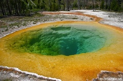 Pool醇厚圆润的碧绿,亦或是Morning Glory Pool明艳照人的橙黄,那深浅明暗的搭配是如此的和谐完美。我们一路上流连忘返,当再次回到Old Faithful时又见到了他的再次喷发,不同的角度,同样的壮观和优美,同样的意犹未尽。 离开Upper