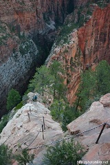 Wiggles时,那21道转弯盘旋而上的山路看的人眼花缭乱。过了Scott Lookout,前面就是那著名的"鲫鱼背"了。窄窄的山脊两边是深不可测的悬崖绝壁,一条粗黑的铁链悬垂在岩石峭壁上,看上去无比惊险,走上去更是惊险无比。我虽然没有恐高症,但此时手抓铁链看着身边的万丈深渊,腿也禁不住在发抖。七点钟我们终于登上了Angle's