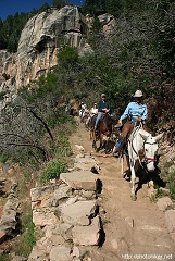 Springs,往返9.4英里,垂直落差近3500ft。一路上同行的有和我们一样的Day Hiker,更多的是从北向南穿越大峡谷的Backpacker。无论男女老少,一个个都装备齐整,步伐矫健,令我们钦佩不已。 GuanGuan和我走走停停,边走边拍照,因此行动迟缓。原本还想一路上尽量走在骡子们前头,结果刚刚过了Coconino