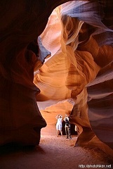 Antelope Canyon无疑是我见过的最神奇美丽的地方之一。在这条长仅150米,宽不过数米的峡谷缝隙中,水流的冲刷加上天长日久的风化将两侧的岩壁雕琢成曲线优美的螺旋型。走在谷地细软的沙地上,感觉如同身处岩洞之中。正午的阳光通过峡谷顶部狭窄的缝隙洒在岩壁上,那明暗相间的条纹,那明亮艳丽的色彩,还有那旋涡状的石壁凹凸交错组成的各种奇妙的优美图案,令人为之震惊,为之赞叹,为之倾倒。在这里,摄影需要精良的设备,过硬的技术以及足够的耐心。GuanGuan是我们这批游客中唯一一个扛着三脚架的,而且为了避开人群,我们一直远远的跟在大部队后面。在如此美景前我是陶醉的,而他是专注的。我们的向导对他也是格外关照,在给众人讲解之余经常特地回过头来找到我们,告诉我们哪个角度光线更好,从哪里可以看到那传奇般的"Monument