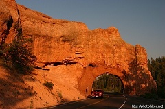 Canyon又给了我们一个意想不到的惊喜。在夕阳的照耀下,路边的岩石红的如燃烧的篝火一般,再配上山谷中的绿树小溪,色彩浓艳的眩目。沿途的美景真是令人目不暇接。奇特的山石,陡峭的山崖,还有那造型如同象鼻山一样奇特的山洞。 八点多我们到达了位于Bryce
