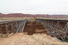 过了大峡谷的North Rim,穿过一路粉红绝壁高耸的Vermilion Cliffs National Monument,我们在中午时分来到了Hwy89A上横跨Marble Canyon的Navajo Bridge。只见新旧两座大桥肩并肩的横跨于Colorado River上方,这两座桥都是单拱钢梁的结构,高度,长度,形状都相差无几。如今新桥通车,旧桥行人。漫步在桥上,碧绿的Colorado River静静的流淌在140多米深的桥下,两边赭红色的绝壁耸立,苍凉而壮观。离开大桥之后我们沿河边的一条小路逆流而上,路的尽头就是群山深处的一片绿洲,Lee’s Ferry。