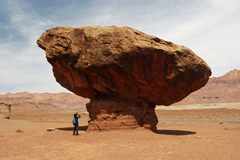 19世纪末到20世纪初,在Navajo Bridge还没有建起来之前,Lee’s Ferry是从Utah到California之间的Colorado河上唯一的渡口,可以想象当时是何等的繁盛。如今上游的Glen Canyon修起了大坝,下游的Marble Canyon建起了大桥,曾经的车马喧嚣都已经湮没在碧水红岩之中了。如今这里是Colorado河漂流的起点,游人从这里的码头上船,乘坐着巨大的橡皮艇沿河而下漂流数天,那样的旅程想想就够惊心动魄了。GuanGuan和我沿着River Trail走了走,河边绿树葱葱,两岸红岩高耸,Colorado River在身边缓缓流过,全然是一种历尽沧桑后的淡然与从容。离开码头后,我们又在路边的一片巨石阵中徘徊良久,其中一块头重脚轻的Balancing Rock还真是挺雄伟惊险的。GuanGuan围着它转了n圈,从各个角度拍了无数的照片,回来以后才发现,这里拍的最好的一张竟然出自我的小DC。