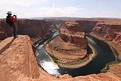 离开Lee’s Ferry,在Hwy89山顶的Lookout稍作停留后我们来到著名的Horseshoe Bend。午后的骄阳下那半英里的山路显得格外的漫长。当我再一次站在悬崖边俯瞰千尺深渊之中碧绿的Colorado River,那无以形容的极致的壮观还是令人为之震撼,一如7年之前的初次相见。与当初不同的是如今GuanGuan手中有了17mm的超广角,终于不用接图就可将整个马蹄湾收入镜头。即便如此,那方寸之间的画面终究还是难以展现大自然的雄奇与瑰丽。