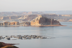 离开Horseshoe Bend后我们直奔今晚的宿营地,位于Lake Powell湖边的Wahweap Campground。穿过小城Page,跨过Glen Canyon大桥后拐上Lakeshore Dr.,小路的尽头就是游船密集的Wahweap Marina。我们先去营地办好了入住手续,随后来到Lake Powell Resort咨询明天的游船事宜。当初的美西之行Page只是个一带而过的地方,对于风光旖旎的Lake Powell更只是惊鸿一瞥。而今故地重游,这里理所当然的成为此行的重点之一。准确的说Lake Powell是Glen Canyon大坝建成后形成的水库,是美国第二大人工水库,仅次于Las Vegas边上的Lake Mead。Lake Powell有着极其曲折绵长的岸线,水道蜿蜒,峡谷幽深,无数的奇风异景隐匿在湖区的深处,而其中最著名的莫过于Rainbow Bridge,世界上最大的天然石桥。