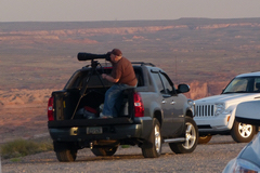 去探访彩虹桥最简便的方法就是乘船游览,从Wahweap码头出发的游船单程要2.5小时。看书上的介绍,拍摄Rainbow Bridge的最佳时间是在下午,而我在制定行程时才发现5月初每天只有上午一班船,早7点出发,中午返回。没想到来到Resort一问,我们竟然被告知明天有下午的游船,而且只此一天。真没想到还能遇到这样的好事,我们赶紧把票买了。然后乐颠颠的开始在附近闲逛。位于Hwy89路边的Wahweap Lookout是个不容错过的好地方,当初还只是一条土路通向一座小山包,如今土路变成了柏油路,路口还设置了铁栅栏门。站在山顶极目远眺,河道蜿蜒,红岩层叠的Lake Powell如同一幅美丽的画卷平铺眼前。原本还打算在这里观满月初升,结果一看东方居然一片阴云低垂,估计得等月上三竿才能看得见了。即便如此,山顶上还是聚集了几位摄影爱好者,架着长枪大炮执着的等待着。我们下山之后又跑到湖边转悠了半天,等天黑下来之后才终于看到一轮明月在乌云中时隐时现。月光皎洁,夜色如梦。