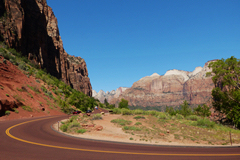兴奋,紧张,失落,恐慌,释然,今天早上的经历可是够跌宕起伏的。感谢上苍,一切终归是有惊无险,我们终于是满心欢喜的来到了Zion National Park的东门。Zion是我们初次美西之行的最后一站,那时已经奔波了十多天的 我们已经完全是强弩之末,勉强支撑着在Zion Valley中转了一天,没有时间也没有精力去探寻更多的美丽风景。如今一进东门,眼前那如波浪般连绵起伏的山峰就让我意识到当初错过的是多么精彩的一幕。Zion也被称为Yosemite Dressed in Red,这里不但红色的山岩随处可见,连山间公路都是赭红色。沿着Zion-Mt. Carmel Highway (SR-9)一路向西,山路迤逦,奇峰,幽谷和怪石在每一个峰回路转处应接不暇。身形伟岸的棋盘山(Checkerboard Mesa),还有众多的奇松怪石无不令我们流连忘返。Zion-Mt. Carmel Tunnel是其中的另一个亮点。这条近一英里长的隧道幽深而狭窄,如果有大型车辆通过的话就要进行交通管制了。开车缓缓行进在这光线昏暗的隧道中,右手边石壁上的洞口就如同一扇扇精美的橱窗,那蓝天下火一般山岩就是其中最美的图画。