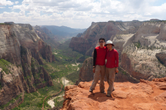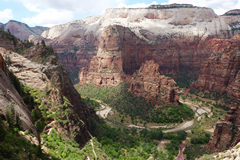 不知道转过了几道山梁,Zion Canyon的宏伟壮观终于再次出现在眼前,我们终于从山谷爬到了山巅。顺着山顶上相当平坦的小路又盘桓了近2km,又钻出了一片树林之后我们总算来到了这位于悬崖之巅的Observation Point。Zion Canyon之中葱郁宽阔的山谷,以及两边壁立高耸的红色山崖在脚下一览无余。Virgin River的蜿蜒柔美,Great White Throne的巍峨,还有Angel’s Landing的险峻,无不彰显着天地自然之中恢弘大气的美。尤其是看着那陡峭山坡上盘旋的之字形山路,心中更是由衷的感慨,无限风光在险峰啊!虽然山顶上并不十分宽敞,但GuanGuan和我还是在上面晃悠了近一个小时,看天空云卷云舒,看山谷中云影变幻。