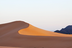 坐班车出了山谷,又驾车穿过隧道出了东门,我们要在日落之前赶到Pink Coral Sand Dune State Park。山路崎岖,等我们赶到公园的时候太阳已经沉入西部的云层之中了。虽然已经错过了摄影的最佳时间,GuanGuan和我还是去沙丘里走了很长一段。Navajo Sandstone是科罗拉多高原上最神奇的岩层,他不但塑造了Zion中的峻峭群峰,成就了Antelope Canyon精美细腻的纹理, 更是造就了眼前这片粉红色的绵延沙丘。夕阳勾勒出沙丘圆润的曲线,为沙漠上原本柔媚的粉紫又添了一抹温暖的金黄。想来以后来这里露营也不错,满天繁星,抑或是月朗星稀,那时的沙丘应该别有一番韵味吧。