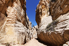 Bull Valley Gorge很多地方既窄又深,从谷底仰望,只见两旁高耸的绝壁夹着一线蓝天。许多松树顽强的生长在峭壁之上,还有不少巨石横空而卧。很快我们沿着谷底又走回了当初开车通过的Skutumpah Rd.,此时我们才惊奇的发现峡谷顶部的缝隙已经被巨石土木填了个结结实实,公里就从上面横穿而过。更令人惊讶的是在堆填的巨石土方之中竟然夹杂着一辆汽车残骸,模样狰狞的悬在半空中,看上去真有些恐怖。据介绍上说1954年这辆小卡车从峡谷顶端的木桥上失事坠落,三人遇难,那辆车便永远的留在了这里。为了安全起见,后人更是弃用了木桥,用巨石以及大的树桩将峡谷顶部填实,而这辆车就成了这路基的一部分。这或许亦是一种对逝者的祭典吧。