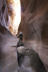 与全程土路的Cottonwood Canyon Rd.相比,Johnson Canyon / Skutumpah Rd.路况要好一些,这两条路同样穿越Grand Staircase-Escalante National Monument,一路风光旖旎,各有千秋。沿Hwy89向东不远就拐上了Johnson Canyon Rd.,我们直奔远处那粉红色的山崖而去。最初的三十多公里是柏油路,当道路变成沉沙荡漾的砂石路时,我们就已经进入了Grand Staircase-Escalante National Monument,不久又拐入Skutumpah Rd.,我们很快就来到第一站,Lick Wash。Lick Wash是个典型的Slot Canyon,峡谷的底部细沙松软,两边是垂直高耸的砂岩,在水流的冲刷侵蚀下呈现出波浪般优美的纹理。由于岩层的结构不一样,峡谷中最窄的地方只能过一个人,而有些地方又开阔得像个庭院。因为后面还有好几处地方要去,GuanGuan和我并没在这里驻足太久,只走了不到2km就返回了。沿着Skutumpah Rd继续向前,下一站Bull Valley Gorge。