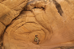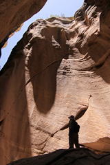 除了在路途上的新奇险峻,峡谷中的景致同样引人入胜。Bull Valley Gorge同样是典型的Slot Canyon,勿庸置疑这里的岩壁凹凸有致,曲线优美。在地势狭窄的地方,从顶部的缝隙投射下的阳光,经过两边螺旋形岩壁的反射,呈现出迷人的金黄色,其造型之优美,线条之细腻完全可以与Antelope Canyon相媲美,唯一逊色的就是色彩。同样是由Navajo Sandstone构成,Lick Wash与Bull Valley Gorge的岩层多为黄褐相间,相比Antelope Canyon那如轻云晓雾般的嫣红,自然是少了一份慑人心魄的梦幻。虽然景色稍逊,但这里有着那些著名景点中难以寻觅的自由自在,你可以在其中尽情的徜徉,遐想,无人打扰,也没有时间限制。