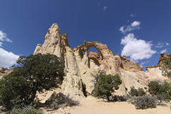 离开Bull Valley Gorge后我们继续北上,沿着崎岖陡峭的Skutumpah Rd.游弋在天高地阔的Grand Staircase-Escalante National Monument中,感受这地广人稀的旷野中独有的原始与豪放。驾车涉水过了Willis Creek后很快就拐上了Cottonwood Canyon Rd.。一路向东过了Kodachrome Basin State Park后原本平坦宽敞的土路就变得坑坑洼洼,而且陡坡不断。已经在Skutumpah Rd.上越野了半天的GuanGuan此时已是踌躇满志,娴熟的上坡,下坡,减速,换档,仿佛开的是威猛的Wrangler,而不是这笨重的Traverse。很快,Grosvenor Arch的高耸身姿从一片黄褐相间的岩石群中脱颖而出了。这是一座高约45米的天然石拱,而且有大小两个拱门。从远处看这一片由Henrieville Sandstone构成的山岩仿佛一座小山一样,Grosvenor Arch则精巧的镶嵌其中。顺着小路可以一直走到石拱的底部,抬头仰望,那悬在半空的弧形拱臂在蔚蓝的天空下显得更加坚实挺拔。不止是形态,岩层中由浅入深的金黄棕褐在蓝天下亦是无不的耀眼夺目。