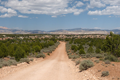 因为前方修路,离开Grosvenor Arch后我们就沿着Cottonwood Canyon Rd.原路返回。回程的路上经过Round Valley Draw,看介绍上说这里景致与Bull Valley Gorge类似,但峡谷更窄更深。想来今天反正没别的安排,我们便一头扎进了通往Round Valley Draw的岔路。一开始小路虽然狭窄,但还算平整,走了不过500米后路况迅速变差,巨大的陷坑乃至深深的壕沟都接连不断的出现,车子一路东倒西歪像个醉汉一般艰难前行。眼看着路况越来越差,车子上下颠簸,左右摇摆的幅度也越来越大,GuanGuan和我渐渐觉得前景不妙。就在我们还在犹豫之中继续前行时,一道深沟赫然出现在眼前,GuanGuan刹车稍稍迟了些,伴随着哐当一声巨响,只觉得车子在迅速下沉之后又猛的弹了起来,可以感觉到底盘已经重重的砸到了地面。车子停住之后,GuanGuan和我先是惊恐万状的互相看了一眼,随后就迫不及待的跳下车去查看。我们趴到地下仔细一看车底才终于松了一口气,原来底盘上前后轮之间有一条粗壮的钢梁连接,方才就是这道梁磕到了地面。再看看刚才越过的那道深沟,夯实的地面已经生生的砸出了条条裂缝。一路上一直志得意满的GuanGuan此时才幡然醒悟,不停的念叨着是他太掉以轻心,开的太快了。如果慢慢的让车侧过来一个轮子一个轮子的过就不会蹲底了。此时我们也终于认清了这车的本来面目,如此又长又宽又重的车身无论如何不适合作越野车。GuanGuan和我这一下着实被吓得不轻,游兴大减,完全没有心思再去Round Valley Draw探奇了。看看前方不远有一片稍微宽敞的空地, GuanGuan在我的指挥下做了n点掉头,我们心有余悸,毫不犹豫的驶离了这方危险之地。