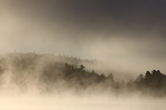 昨天夜里竟然冷得出奇,GuanGuan和我一宿居然被冻醒了三次。躺在睡袋中就觉得浑身的热气在渐渐的挥发,剩下的只有空气中侵肌透骨的寒。最后我 们几乎把能穿的衣服都穿上才勉强睡到天色发亮。既然睡觉已经不是享受,索性就爬起来暖和暖和。信步来到营地边的Richer Pond,只见湖中雾气迷漫,绚丽的秋色静静的隐匿在黎明前的灰暗之中,一只Loon孤独的游弋在平静的湖面上,身后的涟漪静静的荡漾在晨雾缭绕的湖面上。湖对岸的小山坡后面,初升的阳光用金色的光芒由上而下,由淡而浓的渲染着湖面上袅娜的晨雾,还有那于雾中若隐若现的滟滟秋色。这等有如仙境又似梦幻般的景色早已让我们看呆了,全然忘记了昨晚的一夜无眠,以及清晨依旧逼人的寒气。等太阳出来后我们又到旁边的Kettle Pond看了看,没想到区区几公里之遥,这里湖面上风很大,什么晨雾倒影都是浮云了。返回营地的路上我们居然邂逅了Moose一家三口,其中那只公鹿长着硕大的鹿角,非常的漂亮。只可惜相机在后备箱里拿不出来,只能眼睁睁看着它们从我们车前面大摇大摆的横穿马路,随后消失在丛林深处。
