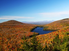 恋恋不舍的从Owls Head下来,GuanGuan和我又回到New Discovery State Park。这里虽然不能过夜,但Hiking Trail都是开放的,还省了门票呢。我们先顺着Osmore Pond Trail环湖而行,随后拐上Big Deer Mt. Trail开始爬山。可是爬到山顶时,Trail竟然在不知不觉中消失在密林中了,那介绍上写的风景绝美的Lookout完全不知所踪。GuanGuan和我在山顶一通乱撞,居然顺着一条羊肠小路来到树林边的悬崖之上。没有山林阻挡的眼前豁然开朗,又一幅层林尽染的山水长卷展现在了眼前。那层层叠叠的山峦象展开的巨幅红毯,从脚下一直延伸到目之所及的天际。这里的秋色与安省并无太大的差别,只可惜安省的地势太过平坦,即使登高也鲜有”极目楚天舒”的豪迈,而Vermont则用她连绵 无际的群山诠释了秋色中少有的大气与壮美。那是一种蕴藏在殷实与深邃中天高地阔的大美,可意会,无以言表。