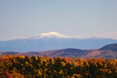 此时此刻,唯一能够留住这美景的只有手中的相机。在一边忙着拍照的GuanGuan忽然指着远处说那边有座雪山。虽说美东有过千米的高山,但还不至于有终年积雪的雪峰吧。我将信将疑的顺着GuanGuan指的方向望去,果然在遥远的地平线上,有一个小小的白色突起在橙红与天蓝的交界处隐约可见,不仔细看还以为是天上的白云。我辨认了一下方位,猛然间闪过一个念头,那会不会是夏天去过的美东第一高峰Mt. Washington呀!我急忙要来GuanGuan的相机,用300mm的长焦镜头将那雪山拉近,那山头上的天线和建筑竟然依稀可见。没错,那就是”一览众山小”的Mt. Washington。那是一座以气候恶劣著称的名山,没准儿昨天晚上大雪纷飞也说不定呢。不过后来我们才得知,那山上的白色是霜冻而非冰雪。可惜我们时间有限,没有机会去一睹那银白色的童话世界了。以前我经常对GuanGuan说相机捕捉下来的画面远没有实际看到的漂亮,但这一次不得不承认借助了长焦镜头后,那圣洁的”雪峰”与广袤无垠的秋色构成了一幅秋日奇景,可遇,而不可求。