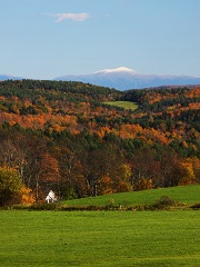 从Big Deer Mt.下来已经是午后两点了,我得考虑今晚的住宿问题了。按计划明天要去Stowe,后天要沿Hwy100南下,再加上GuanGuan对今早的晨雾仍然念念不忘,因此我选中了位于Hwy89与100交界处,同样是有山有水的Little River State Park作为落脚点。此时看时间尚早,我们又驱车到东面的Peacham小镇转了转。Vermont面积不大,人口密度低,许许多多的小村镇散布在山林农场之间,一座尖顶教堂,一两间杂货店和咖啡馆几乎就是镇中心的全部了。Peacham就是这样一个座落在山坡上的微型小镇,碧绿的农场,远山的秋色,还有Mt. Washington晶莹的雪峰就象画一样展现在眼前。伴着秋日的艳阳我们顺着Hwy302回到Vermont的首府Montpelier。这里没有一点作为州府应有的繁华,看不见高楼广厦,只是一座朴实无华的山区小城而已。我们在城外的麦当劳吃了午餐+晚餐,又去旁边的超市采购了一堆水果沙拉外加一只烤鸡。在夕阳西下之前我们终于来到Little River State Park。